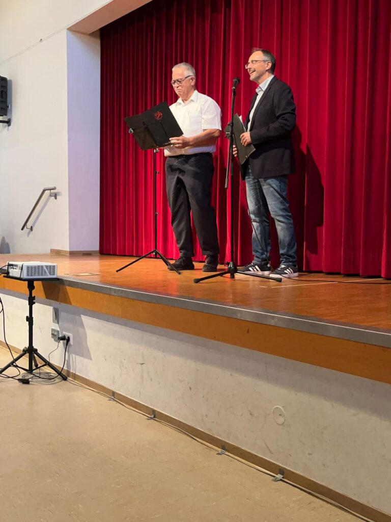 Gemeinsam mit dem Vorsitzenden Ralph Poh vom Kulturverein eröffnete unser Vorsitzender Volker Hörner den Festabend und begrüßte die Besucher, die den Weg in den großen Saal des Dorfgemeinschaftshauses in Mörlheim gefunden hatten. Die lange Geschichte Mörlheims wurde durch selbst gedrehte Filmszenen und Einlagen von Mörlheimer Jugendlichen erzählt. Neben den Informationen aus der Geschichte kam es zu mehreren lustigen Momenten, bei denen die Besucher die Akteure hinter den Kostümen erkannten. Auch unser stellvertretender Vorsitzender Achim Goldemann als „Erzähler“ wurde SUPER in Szene gesetzt. Alles Laienschauspieler aus Mörlheim – aber trotzdem super dargestellt!!!