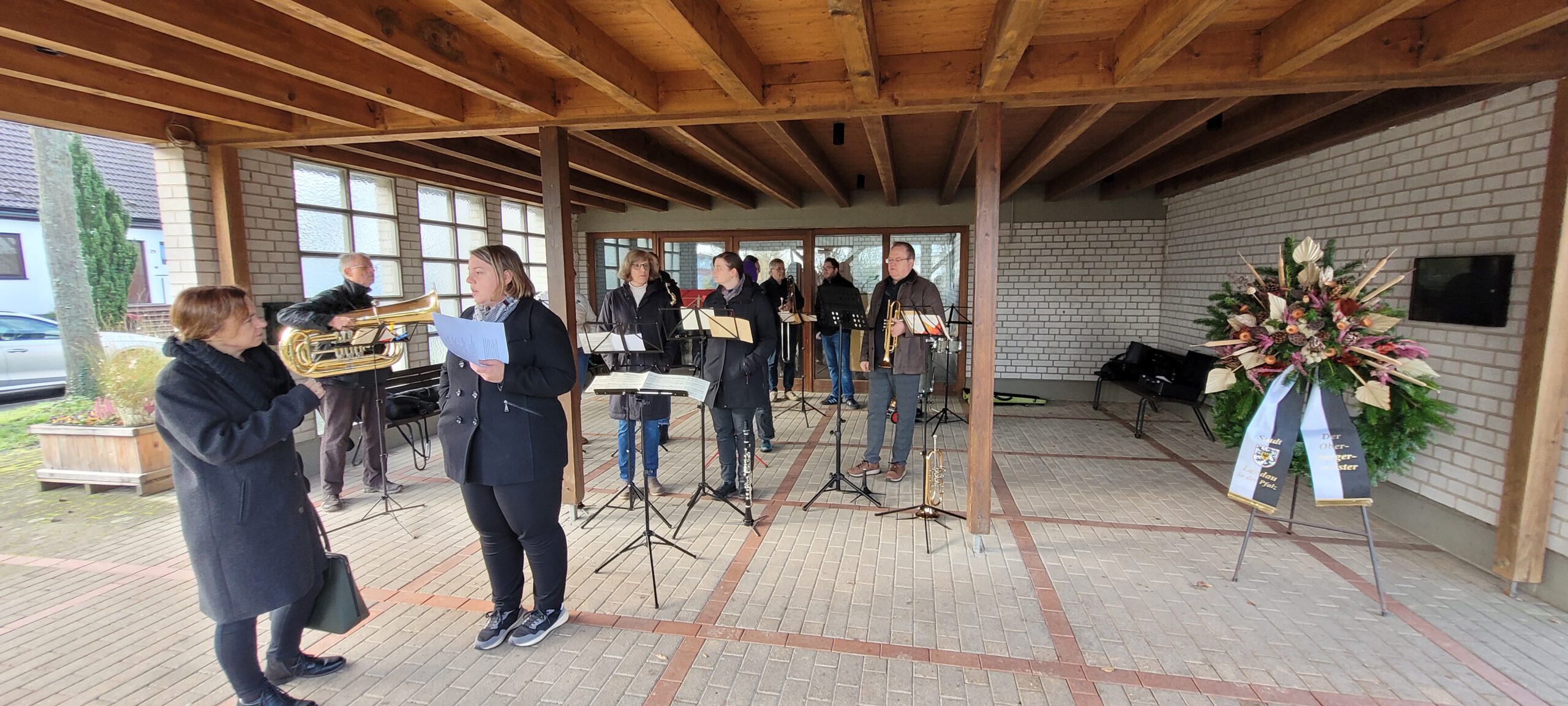 Unser zweiter Auftritt an diesem Tag fand dann gegen 11:00 Uhr im Nachbarort Queichheim statt. Leider ist auch hier festzustellen, dass die Besucher der Gedenkveranstaltung deutlich zurück gehen. Es mögen wohl auch hier Anwesende im mittleren zweistelligen Bereich gekommen sein. Neben dem Ortsvorsteher Herrn Adrian Koder-Horsten richtete noch die Gemeindereferentin Frau Bärbel Grimm weitere Worte an die Gemeinde. Im Anschluss wurde durch den Queichheimer Schützenverein der Kranz ebenfalls am Ehrenmal zum Gedenken der getöteten Mitbürger des Stadtteils niedergelegt. Nach dem offiziellen Teil spielten wir noch am Grab unseres langjährigen Dirigenten Rudi Bendel.